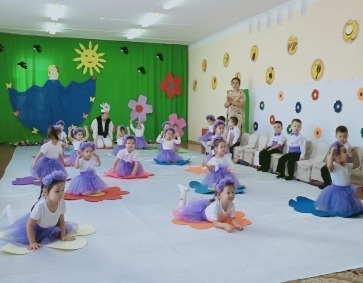 Жүргізуші: Дұрыс балалар, көктем мезгілінде күн жылынып, қар еріп, жылы жақтан құстар ұшып келеді, ағаштар бүршік жарады, табиғат сұлулана түседі.Олай болса балалар бәріміз бірге аналарымыздың мерекесін ән шашумен бастайық.