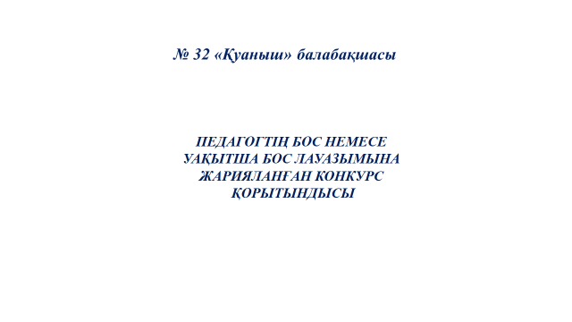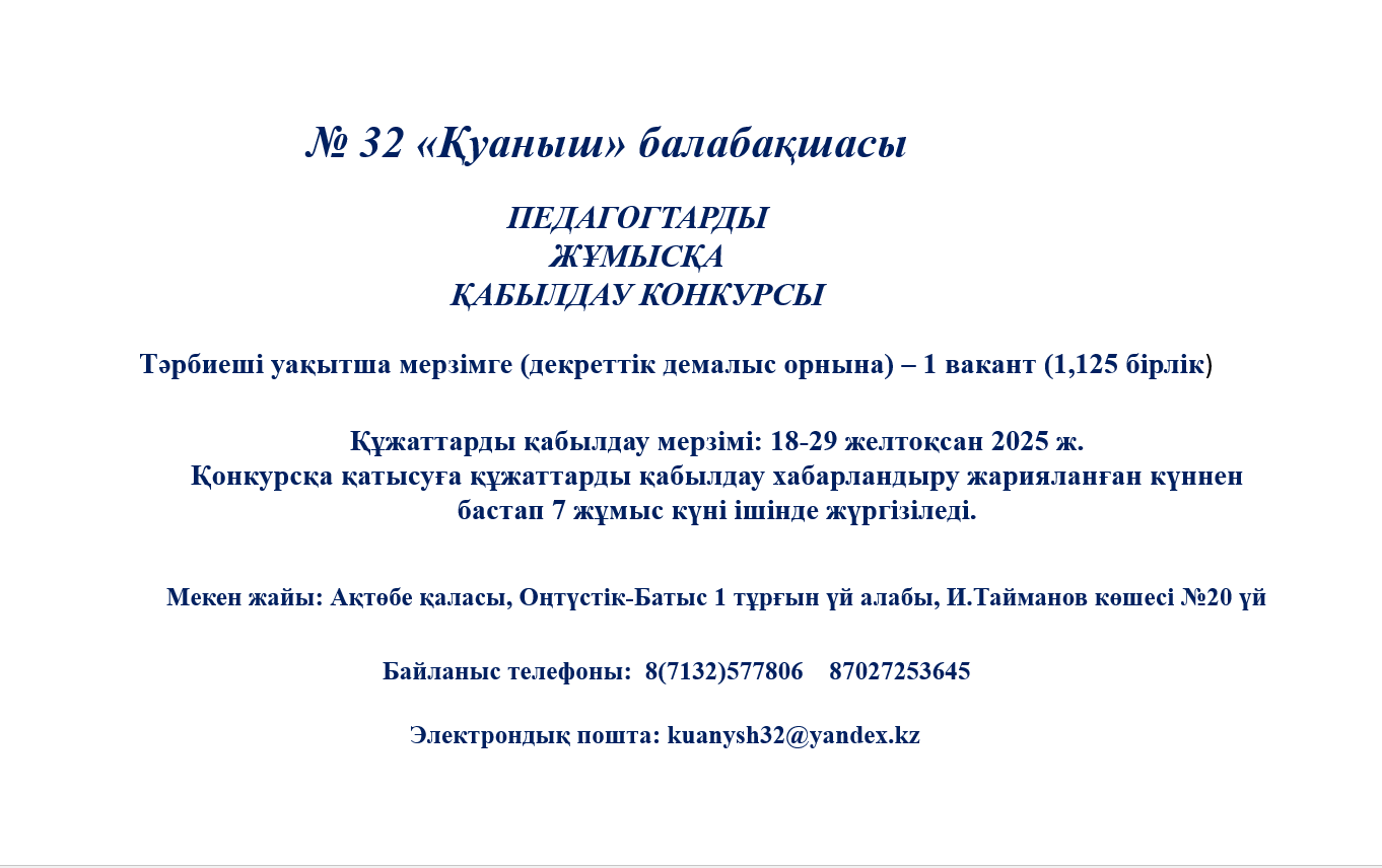 МКҚК №32 «Қуаныш» балабақшасы педагогтерді конкурстық негізде жұмысқа қабылдау.